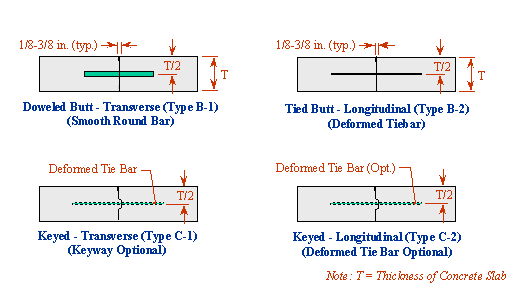 Construction joints join concrete that is paved at different times. Transverse construction joints are necessary at the end of a paving segment, or at a placement interruption for a driveway, cross road or bridge. Longitudinal construction joints join lanes that are paved at different times, or join through-lanes to curb and gutter or auxiliary lanes. The details below show the different types of construction joints and their dimensions.
