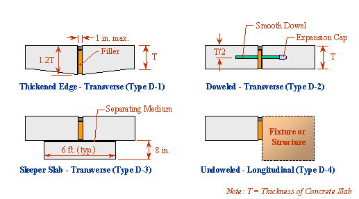 Isolation joints separate the pavement from objects or structures, and allow independent movement of the pavement, object or structure without any connection that could cause damage. Isolation joints are used where a pavement abuts certain manholes, drainage fixtures, sidewalks and buildings, and intersects other pavements or bridges. The details below show the different types of isolation joints and their dimensions.
