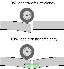 Each type of joint provides a different ability to transfer load across slabs. This ability is termed load transfer efficiency (or effectiveness). It is determined as shown in the figure. Note how both sides of the joint deflect evenly at 100% load transfer efficiency.